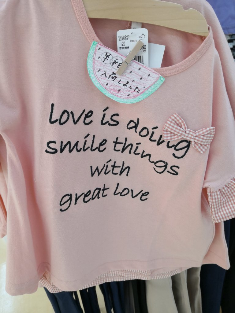 Thus concludes the best of my collection so far. I actually have trouble believing how often I see English on clothes and wonder, “why does that shirt say that?” You would think that maybe they would get a native speaker, or someone more familiar with English to at least spell check these things before they decide to run with them. But apparently the demand is not high enough to be of any concern. It would be difficult to find someone to do such a small job, and most Japanese people wouldn’t understand it either way. A dreadful situation, really. But fortunately, it gives me a golden opportunity. Maybe every once in a while I’ll share some new ones I find.