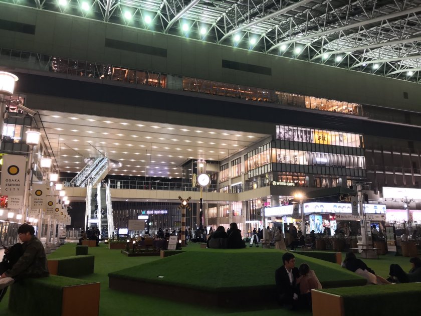 I went back to Osaka station, but instead of going straight to the trains, I decided to look around. I was overwhelmed by how absolutely massive it was. I think it would be accurate to say that it was the biggest place I had ever been in. Even if I spent an entire day exploring it, I would never get to look at everything (and it would be exhausting). I found a lovely “green park” above the tracks where I could relax and stare in wonder. Across from me was a cafe devoted to the anime Detective Conan, which seems to be quite popular here. The cafe was quite popular, too. There was always a line.